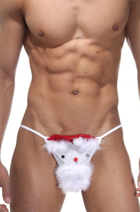 Трусы-стринги белого цвета, на тонких резинках. Спереди Санта Клаус, с белой бородой, глазами и в красном колпаке.