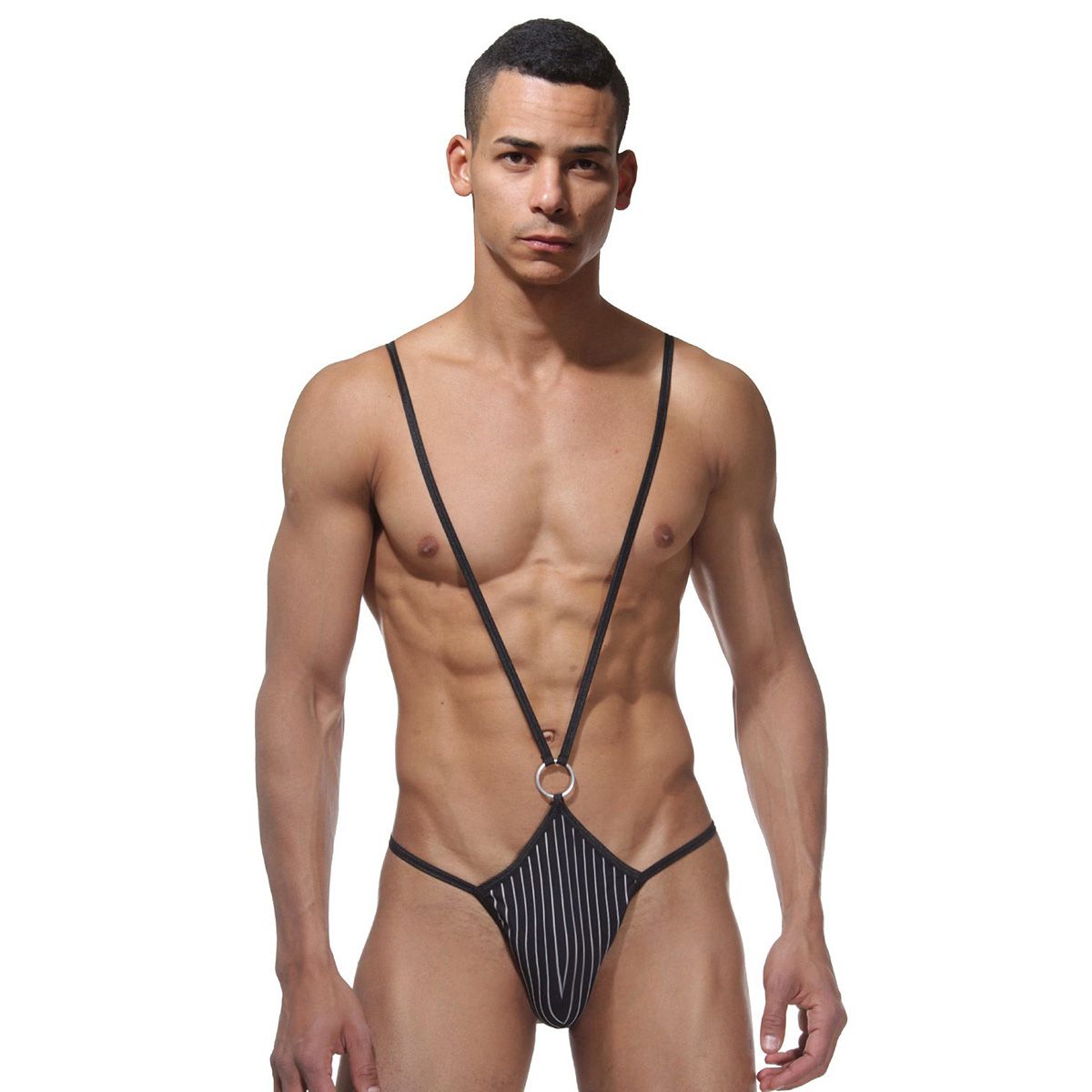 Мужское боди на лямках с открытыми ягодицами и украшением в виде серебристого колечка на пупке. Отлично подойдет тем, кто не стесняется своего тела и любит эксперименты в интимной жизни. Боди выполнено из эластичной ткани, поэтому оно хорошо сядет на любой тип фигуры и не будет создавать дискомфорт.