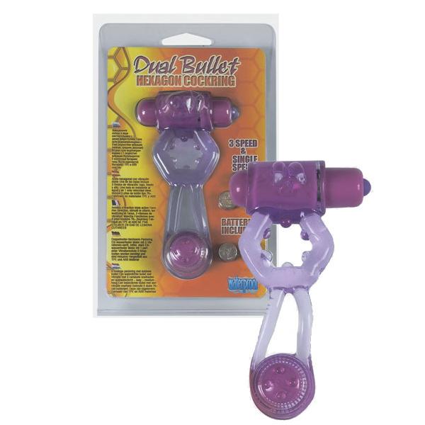 Фиолетовое эрекционное кольцо с вибропулей и стимулирующим хвостиком. Батарейки в комплекте.