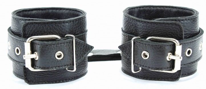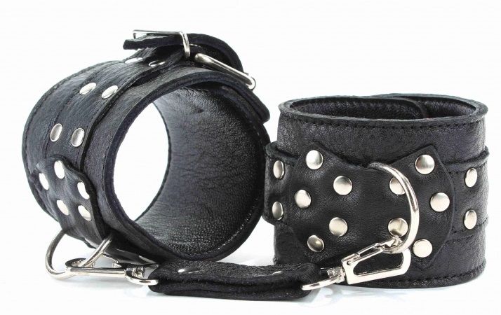 Кожаные наручники черного цвета. Украшены заклепками и соединяются между собой цепью с карабинами. Размер наручников регулируется при помощи застежки Ширина - 6 см. Длина цепочки - 15,5 см.